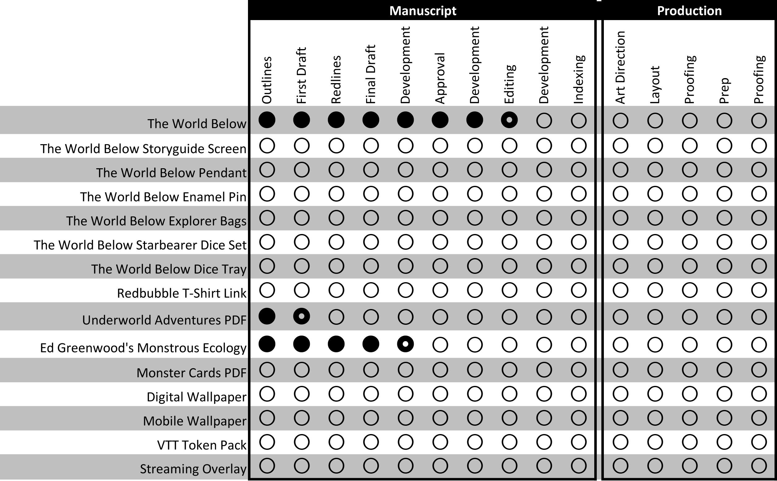 There's a lot of stuff on this list! Our main reward, The World Below PDF, standard and deluxe hardcover, along with the Print-on-Demand option, is all part of that first line, and those various formats will be rewarded at different stages near the end of the production side. Right now, we can see that the manuscript is in editing before one final development pass finishes that up and then it's on to Art Direction.
